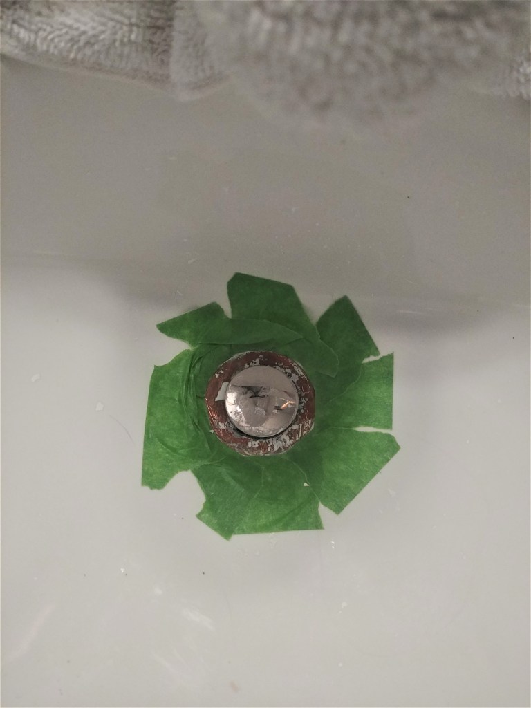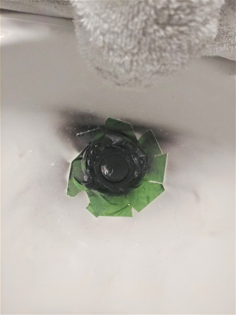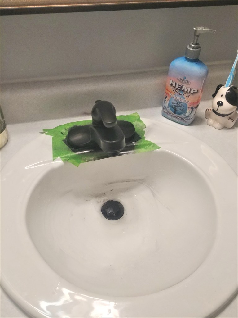 If you opt out of removing your faucets like I did, tape around the faucet. Try to push the painters tape under the lip of the faucet for a good tight fit. Then Place cardboard, towels or newspaper behind faucet on backsplash and anywhere else that overspray might get on. This includes inside the sink.
