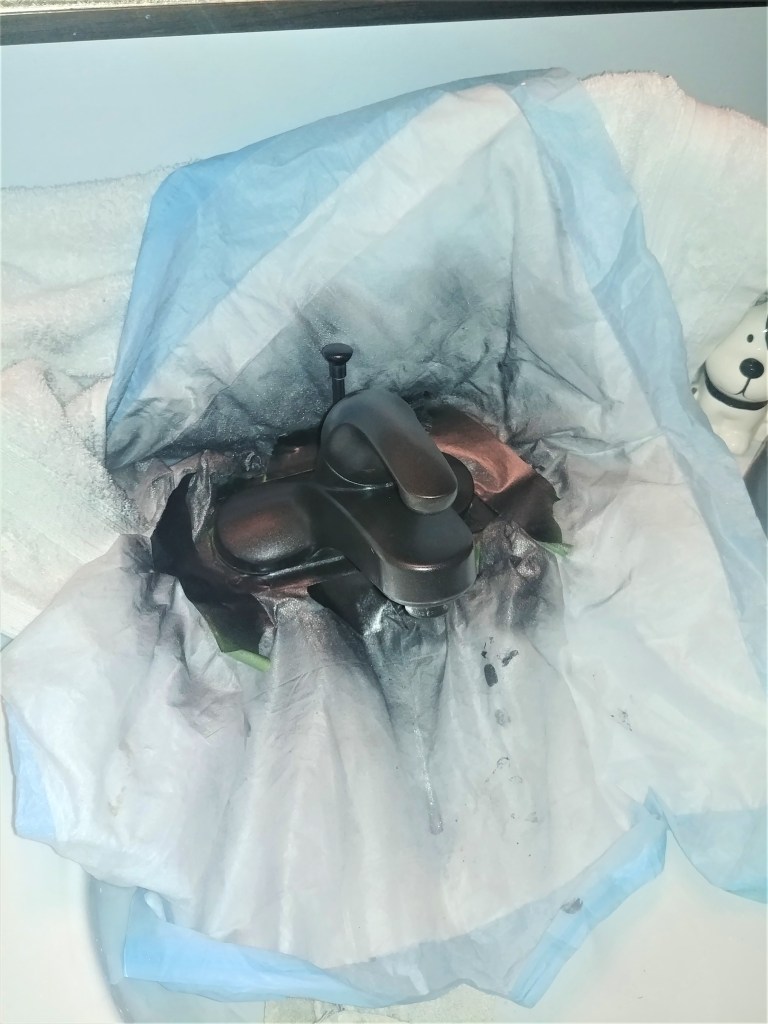 Lightly sand your faucets so that they loose their shine. You will want to make sure to rough up every area of the faucet. Handle, faucet area and the drain (you will want to tape off the drain as well so you dont have a chrome drain with bronze faucet). You don’t want to use really gritty sand paper because it will leave deep scratches in the metal.